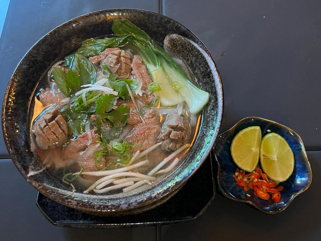 traditionelle Pho-Suppe mit gebratenem Rindfleisch, frischem Koriander, Lauchzwiebeln & Sojasprossen in Rinderkraftbrühe